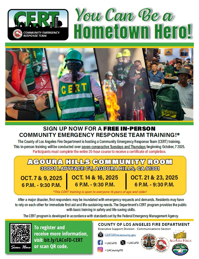 Residents interested in becoming certified CERT members can take advantage of free in-person classes offered by the Los Angeles County Fire Department. The in-person sessions will be held throughout October at the Agoura Hills Community Room.