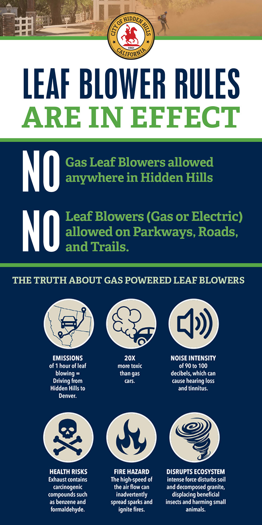Since 1994, gasoline powered leaf blowers have been prohibited throughout the City of Hidden Hills. This prohibition was put in place as the use of gas powered leaf blowers raise concerns about excessive noise, air pollution, and exposure to particulate matter.